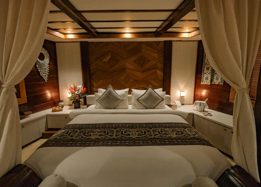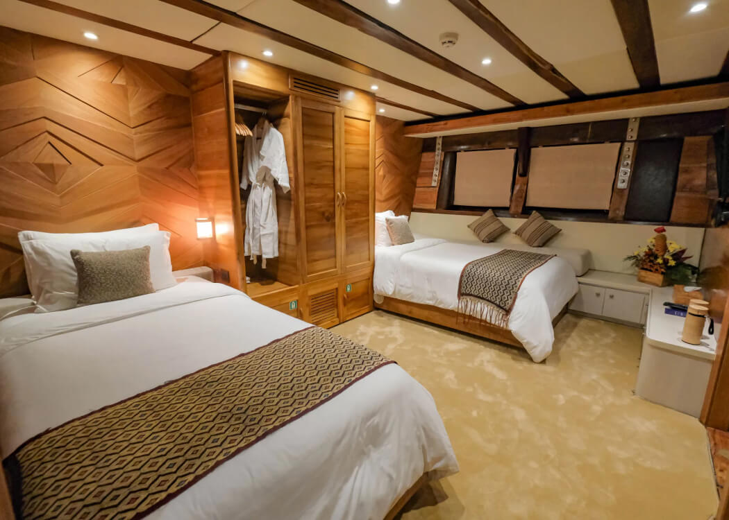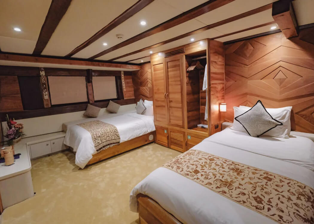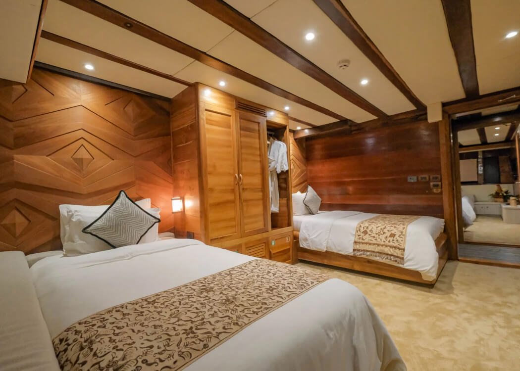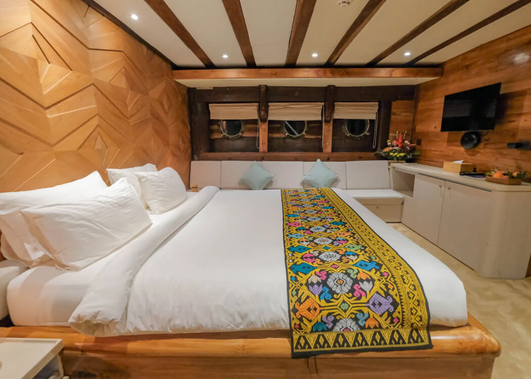 The largest cabin onboard at 30 sqm, this room offers a king-size bed (204 cm x 204 cm), air-conditioning, and a 42-inch TV with over 200 movies updated yearly. It also includes a closet, a safety box, and an ensuite bathroom with a walk-in shower, toilet, and two vanities.