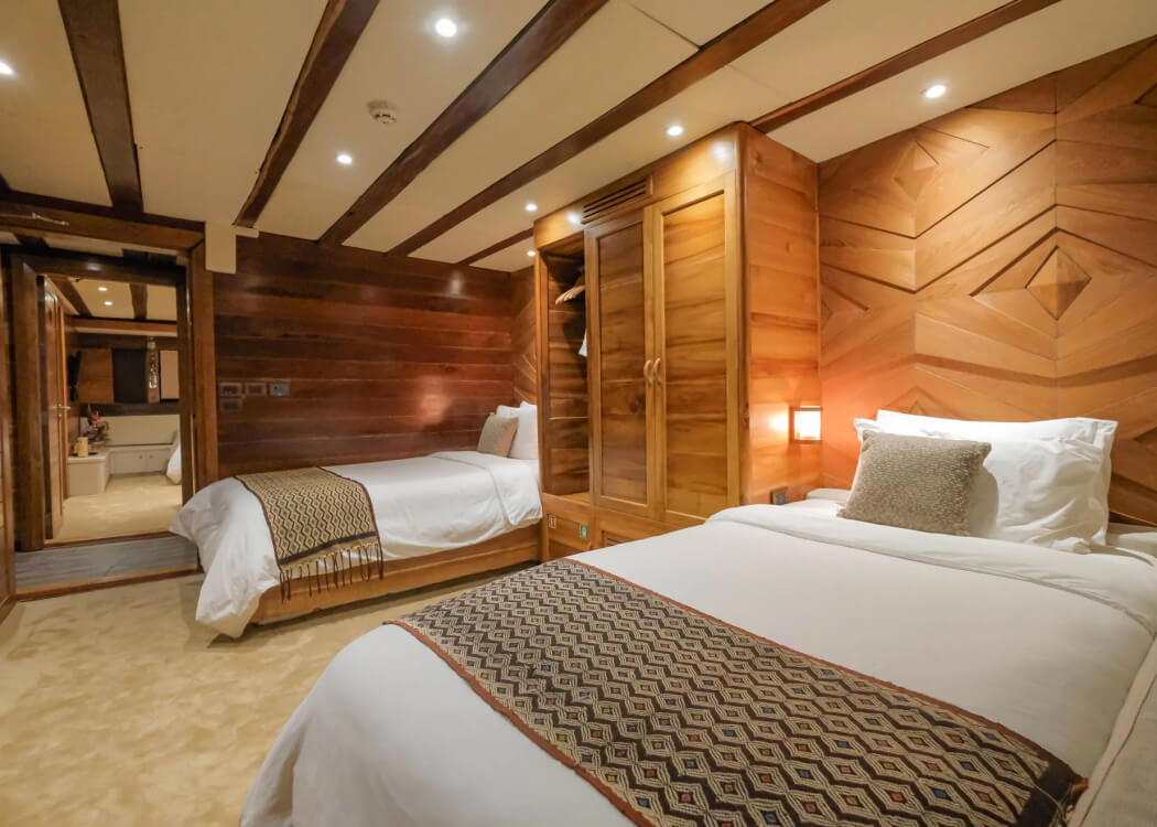 This 25 sqm cabin with a 2.50 m ceiling features two comfortable single beds (110 cm x 204 cm). It includes air-conditioning, a 42-inch TV with over 200 movies updated annually, a closet, a safety box, and an ensuite bathroom with a walk-in shower, toilet, and dual vanities for your convenience.