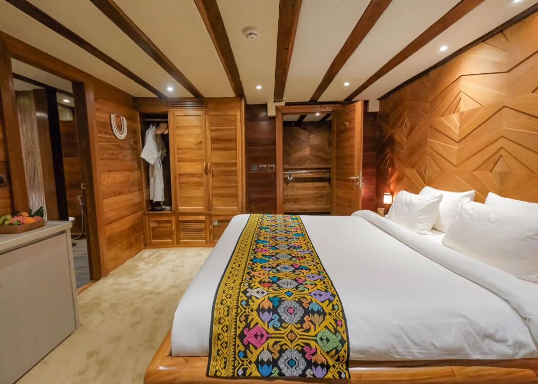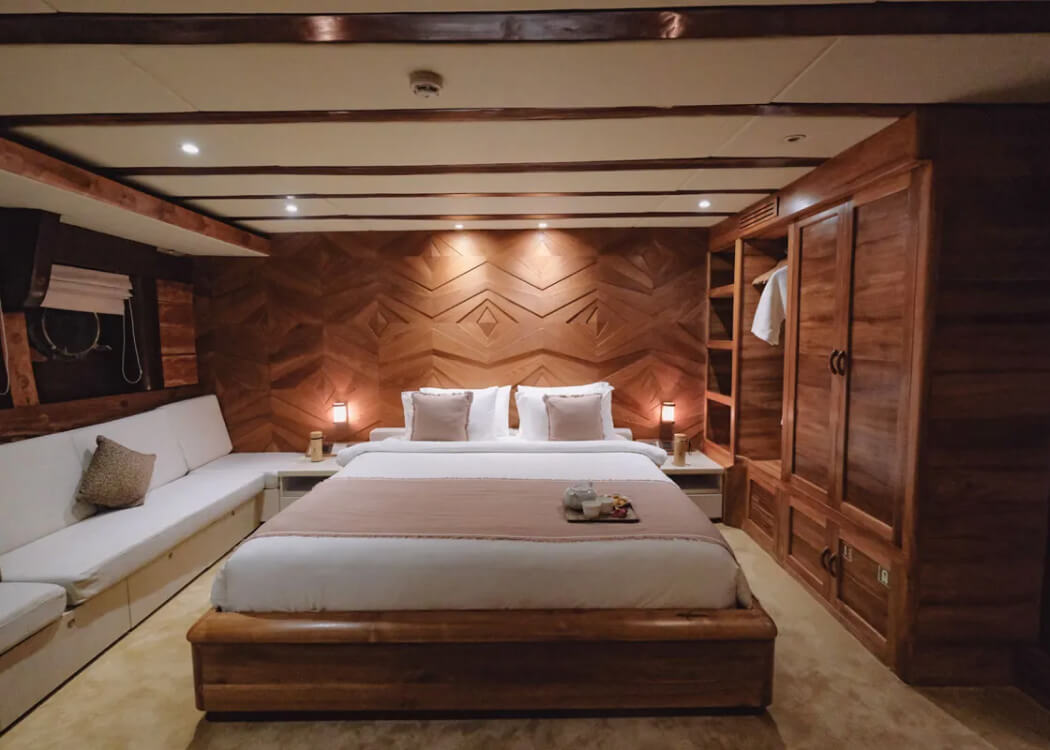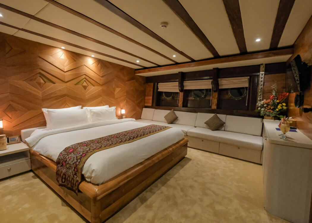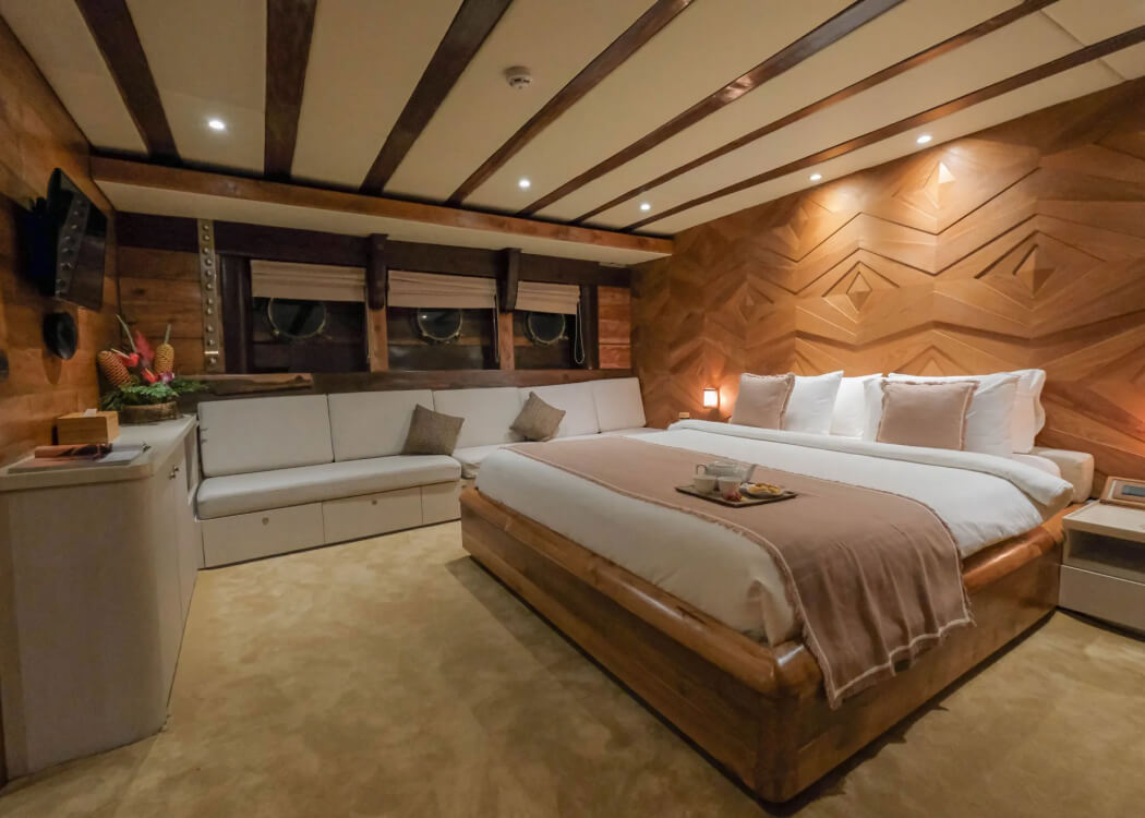 The Master Cabin is spacious, covering 45 sqm with a ceiling height of 2.50 m. It features a comfortable king-size bed (204 cm x 204 cm), air-conditioning, and a 42-inch flat-screen TV with over 200 movies to enjoy. There’s a closet for your belongings and a safety box for valuables. The ensuite bathroom includes a walk-in shower with rain and hand options, a separate toilet, and two vanities for extra comfort.