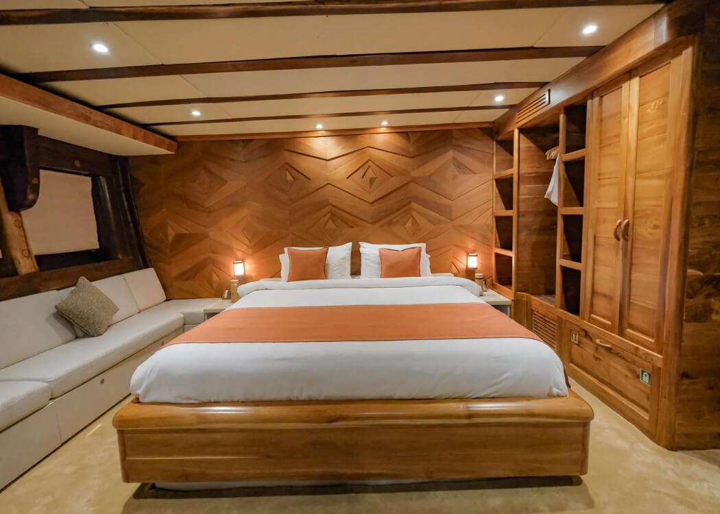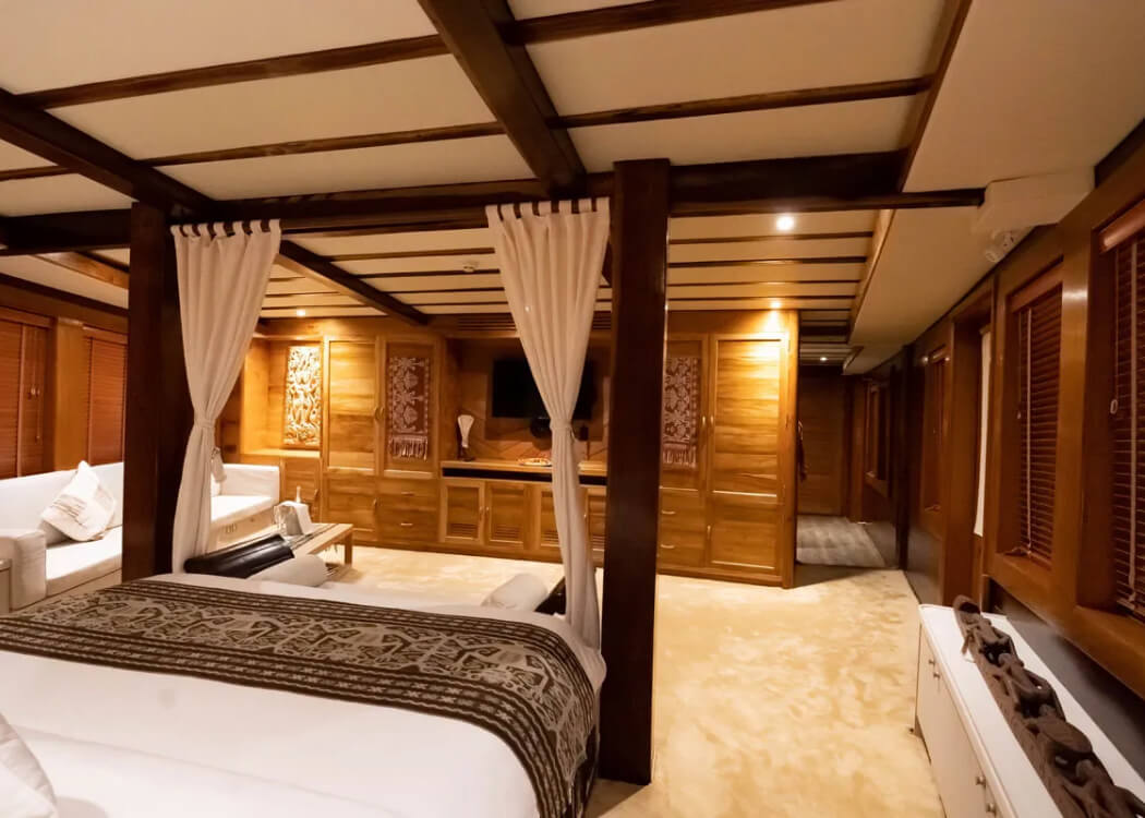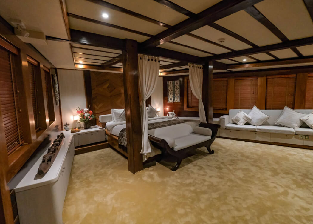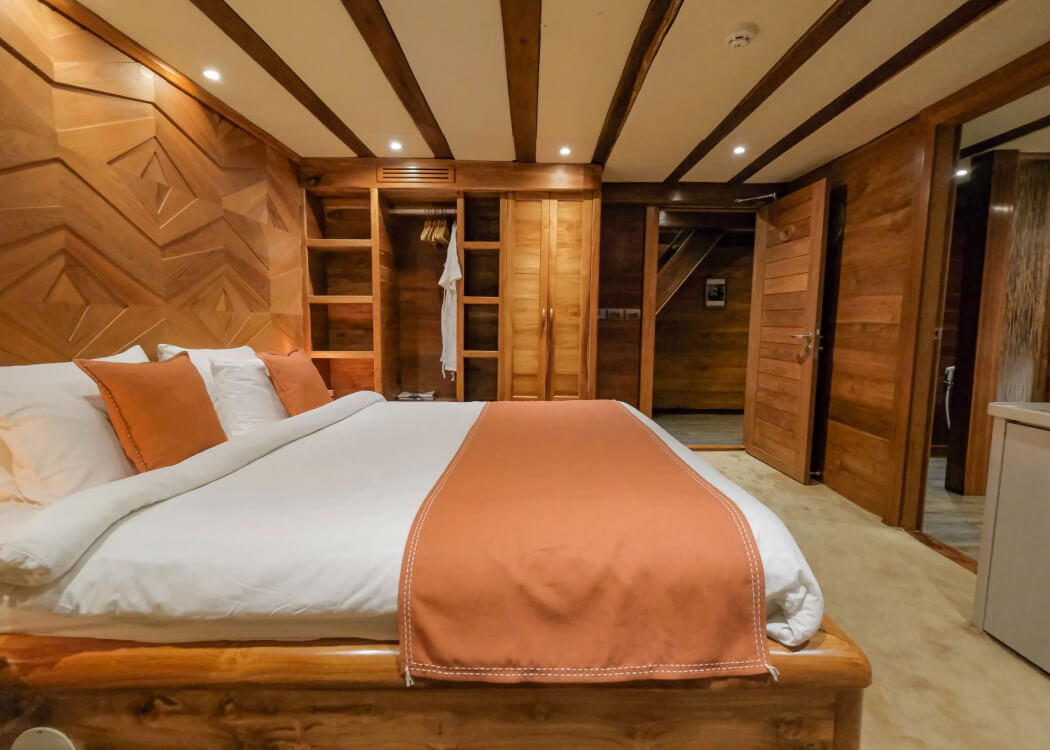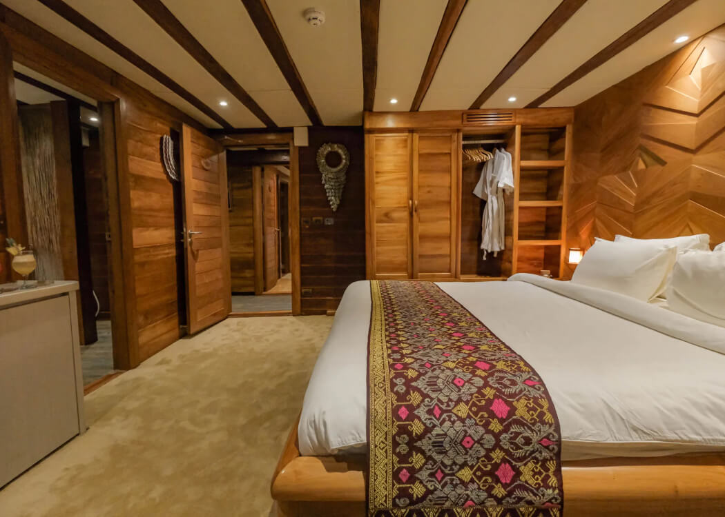 The Master Cabin is spacious, covering 45 sqm with a ceiling height of 2.50 m. It features a comfortable king-size bed (204 cm x 204 cm), air-conditioning, and a 42-inch flat-screen TV with over 200 movies to enjoy. There’s a closet for your belongings and a safety box for valuables. The ensuite bathroom includes a walk-in shower with rain and hand options, a separate toilet, and two vanities for extra comfort.
