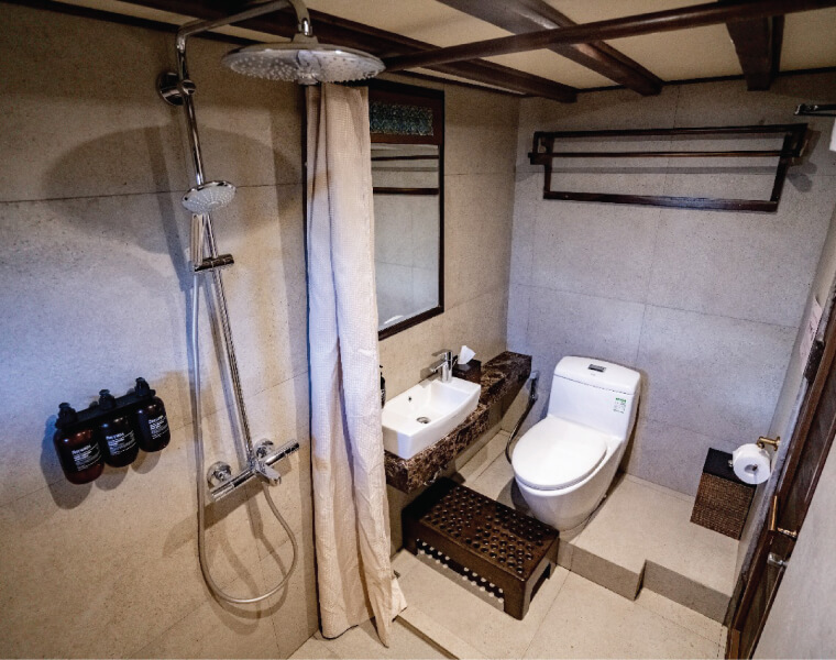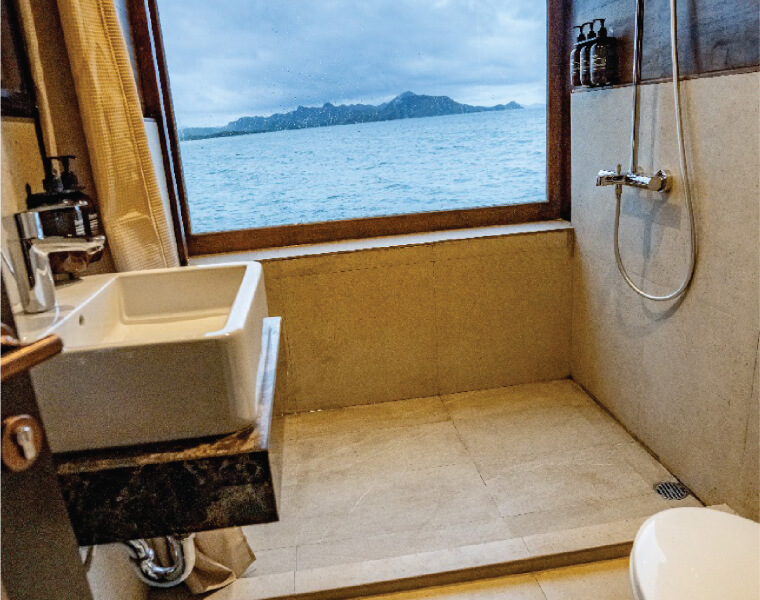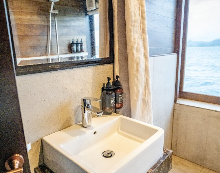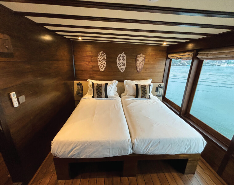 This cozy cabin features twin beds and an en-suite bathroom with a stylish modern design. Equipped with hot and cold showers, premium Grohe fixtures, a hair dryer, bathrobe, towels, and a safety box, it provides comfort and functionality for your stay.