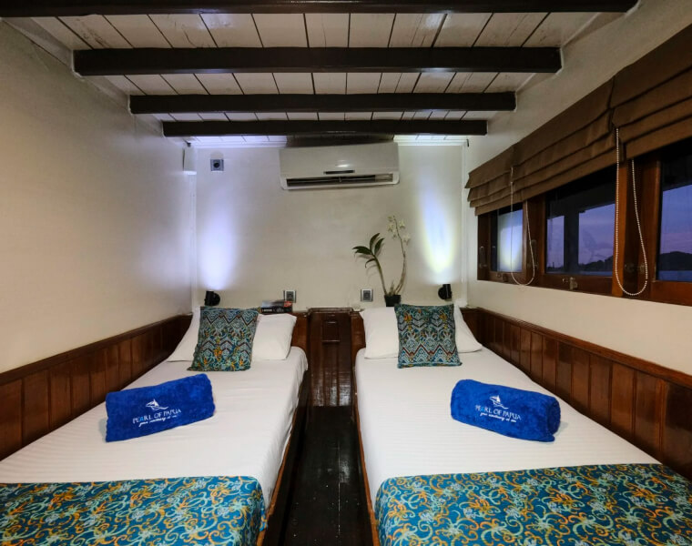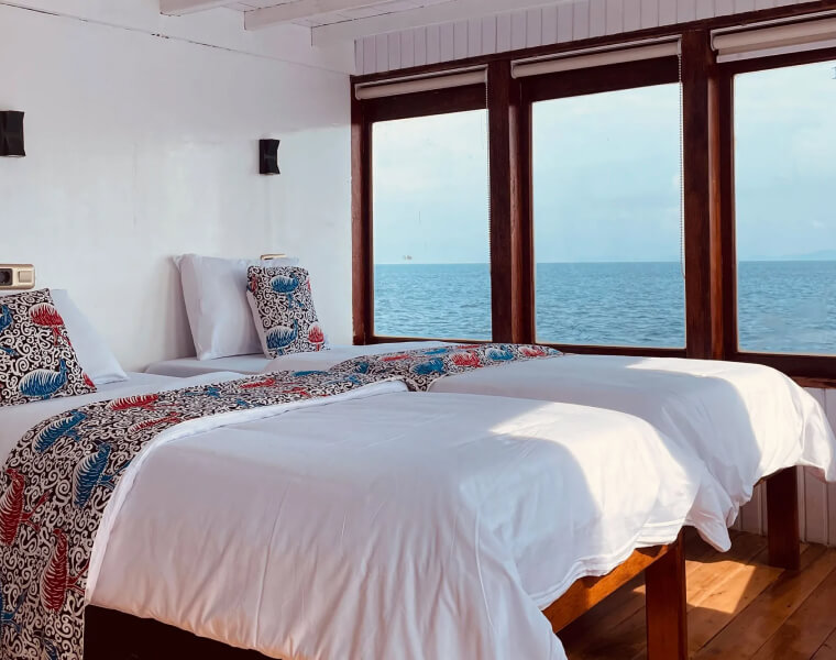 Situated on the upper deck, this cabin includes twin beds, ensuite bathroom, and big glass windows.