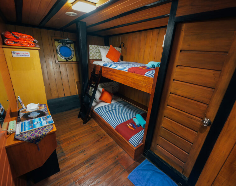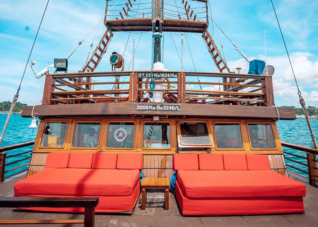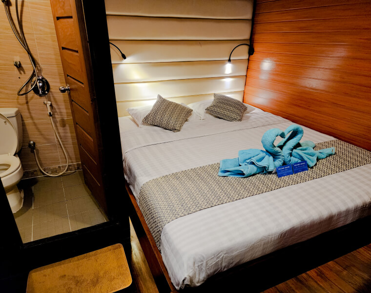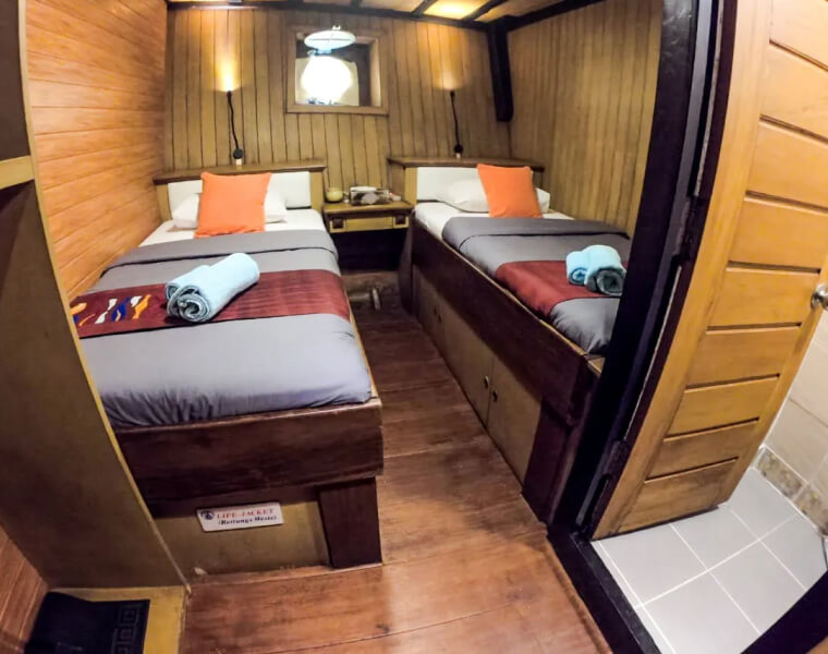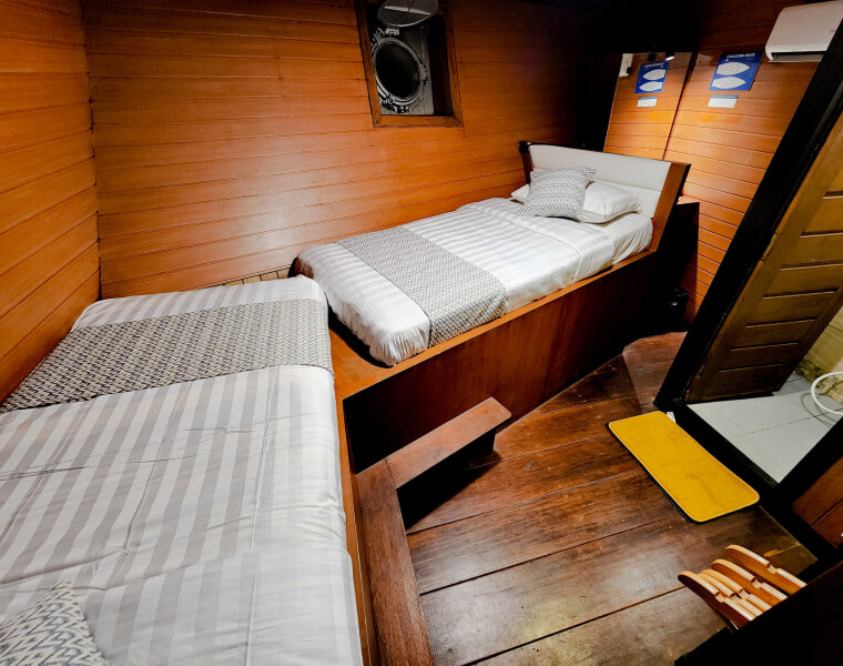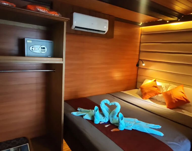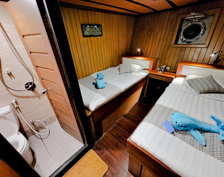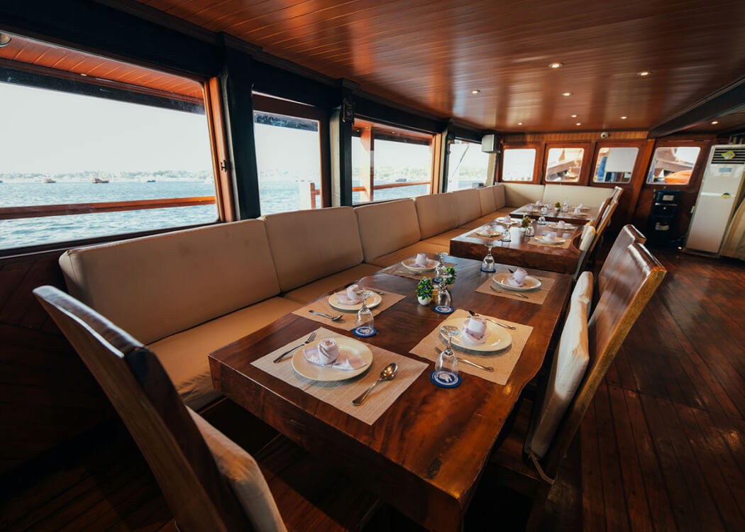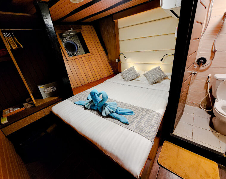 The vessel accommodates up to 26 guests in 12 deluxe cabins, comprising 6 double bed cabins, 4 twin bed cabins, 1 cabin with two bunk beds (suitable for 4 persons), and 1 cabin with a single bunk bed (for 2 persons). Each cabin is air-conditioned and equipped with en-suite bathrooms featuring hot and cold showers, hair dryers, bathrobes, towels, safety boxes, and hand sanitizers to ensure a comfortable stay.