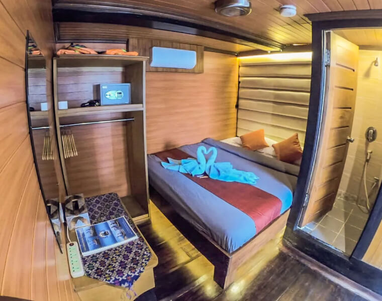 Each cabin features an en-suite bathroom with hot and cold showers, along with a hair dryer, bathrobe, towels, and a safety box for added comfort and convenience.