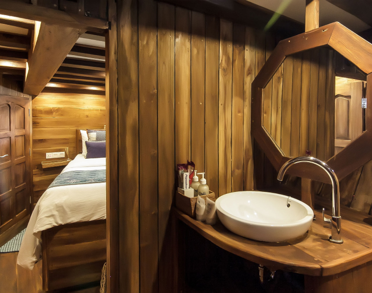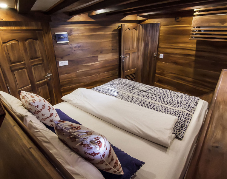 Located midships on the lower deck are the largest cabins and feature a daybed that can comfortably accommodate a 3rd guest. The king-size bed can also be split into separate twin beds.